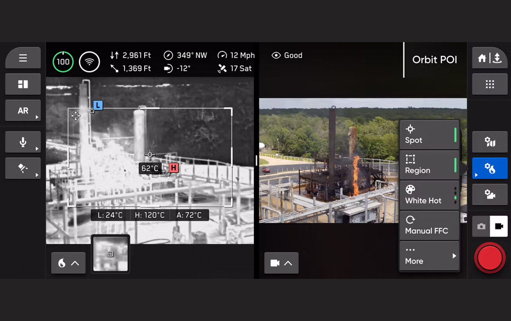 Equipped with thermal imaging capabilities making it a powerful tool for a variety of applications that require heat signature detection. Its integrated thermal camera allows for high-resolution, real-time thermal imaging, enabling users to identify heat anomalies in challenging environments with infrastructure (such as identifying overheating electrical components), and inspections. The drone’s powerful 4K camera system allows for high-quality imagery and video capture, providing users with detailed insights and data.
